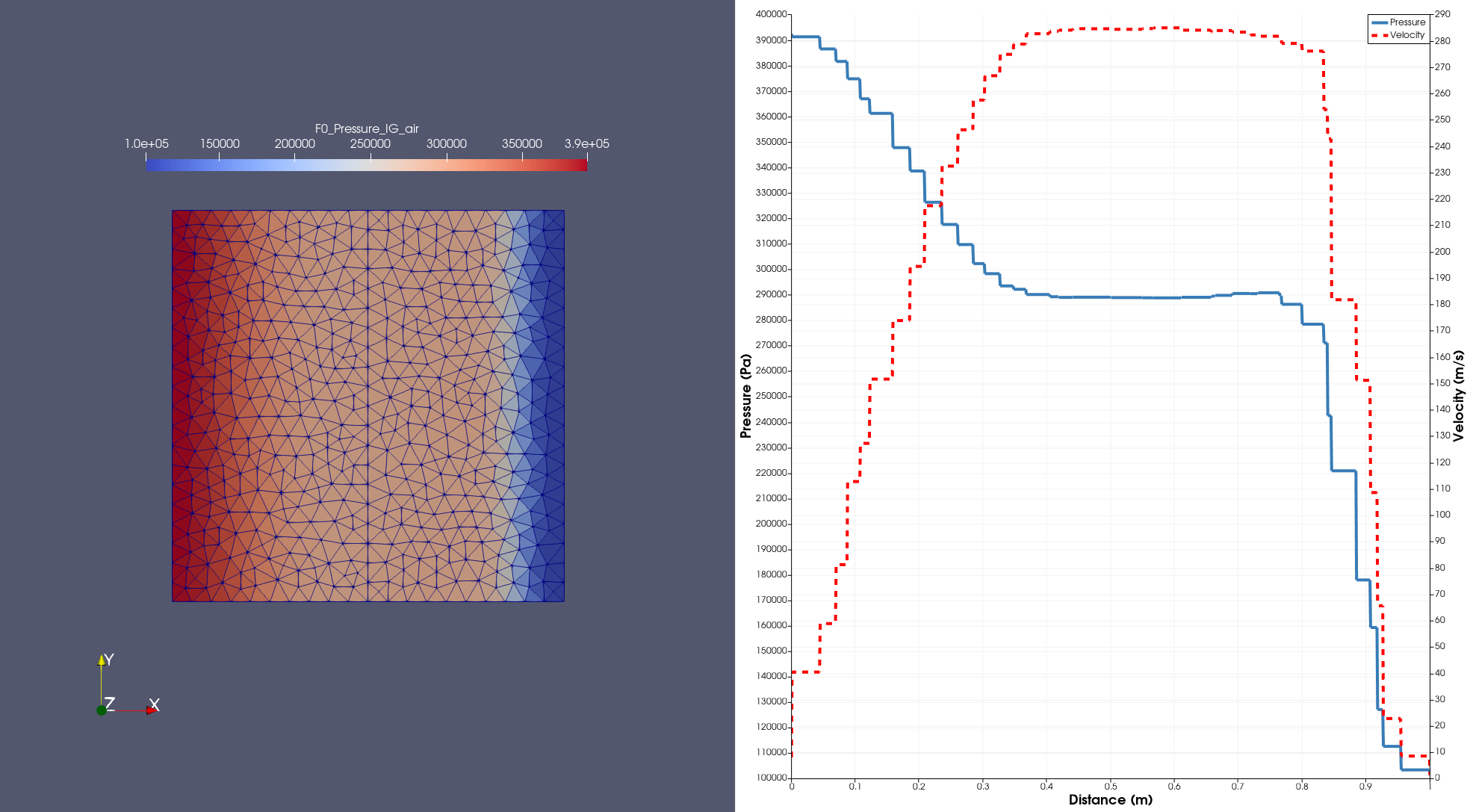 Fig. 15 Pressure visualization (left) and 1D plot of pressure and velocity along the length of the tube (right) at the initial time. Visualization using Paraview software.